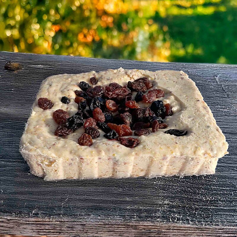 - 1x Vetblok met vruchten (rozijnen), een echte traktatie voor bessenliefhebbers.