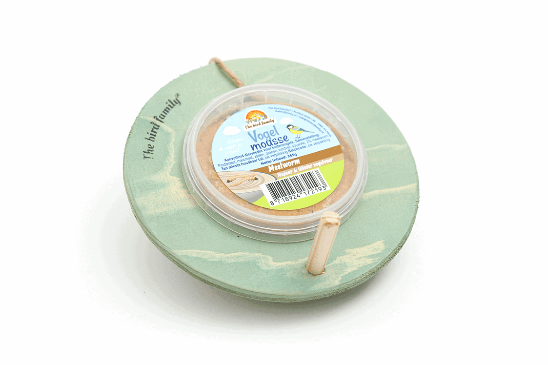 De potjes vogelmousse zijn gemaakt om te plaatsen in de voederring van hout. Deze voederring met vogelmousse is eenvoudig op te hangen aan een tak, tuinafscheiding of balkon. Door het slingeren en ronddraaien van de voederring krijgen kleine tuinvogels het meeste kans om zich te goed te doen aan deze lekkernij. De vogelmousse is 100% geschikt voor alle vogels en is daarnaast ook zeer geschikt voor jonge vogels. De vogelmousse is rijk aan eiwitten, koolhydraten, proteïnen, vitamines, oliën en vetten.